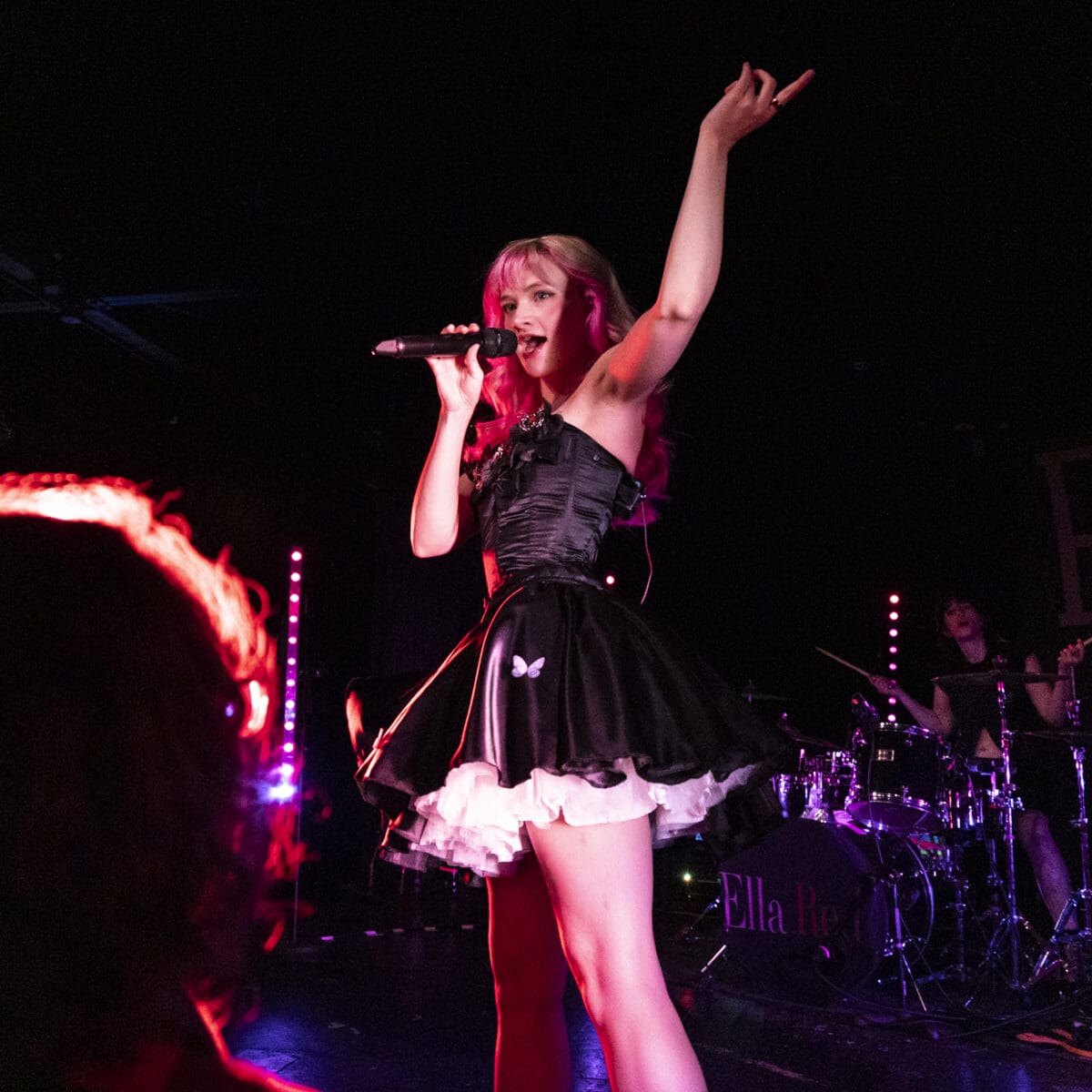 Ella Red’s first headlining tour brought her to the Bottleneck Monday night, with fans singing along to every song of her debut album It’s Not Real and leaving with stories of her pet tarantulas. She even went as far as to hand paint stickers of her tarantulas to give fans buying merch. Her energy was infectious, jumping constantly and asking the audience to join her. During her song “Party Animal,” Ella chose a special audience member to award a deer antler headband as she joined fans on the Bottleneck floor. Following the tour’s lovebug theme, fans were covered in various fake bugs, pink, and spiderwebs.